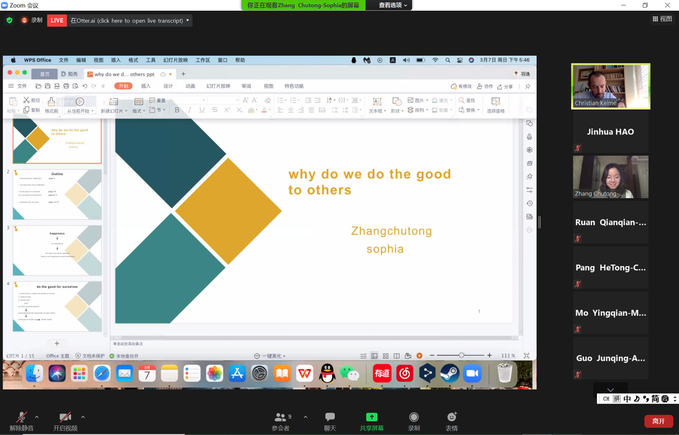 March 7 is the last day of the project. By the arrangement of the teaching assistant, everyone conducted a final preparation exercise between 10:00 and noon. They listened to the suggestions of Mr. Roy and were proficient in the presentation and perfected the content of the PPT. The report of final preparation officially started at 4 pm. According to the order of speaking, each student has about 15 minutes to give a speech, and Professor Christian has about 5 minutes to communicate and discuss with the reporting students. After all the students completed the report, Professor Christian asked about each student’s plans and encouraged everyone to work hard according to their plans. He hoped to continue to keep in touch with the students and the School of Philosophy and Social Sciences of Jilin University, and finally sent it. sincere blessing.