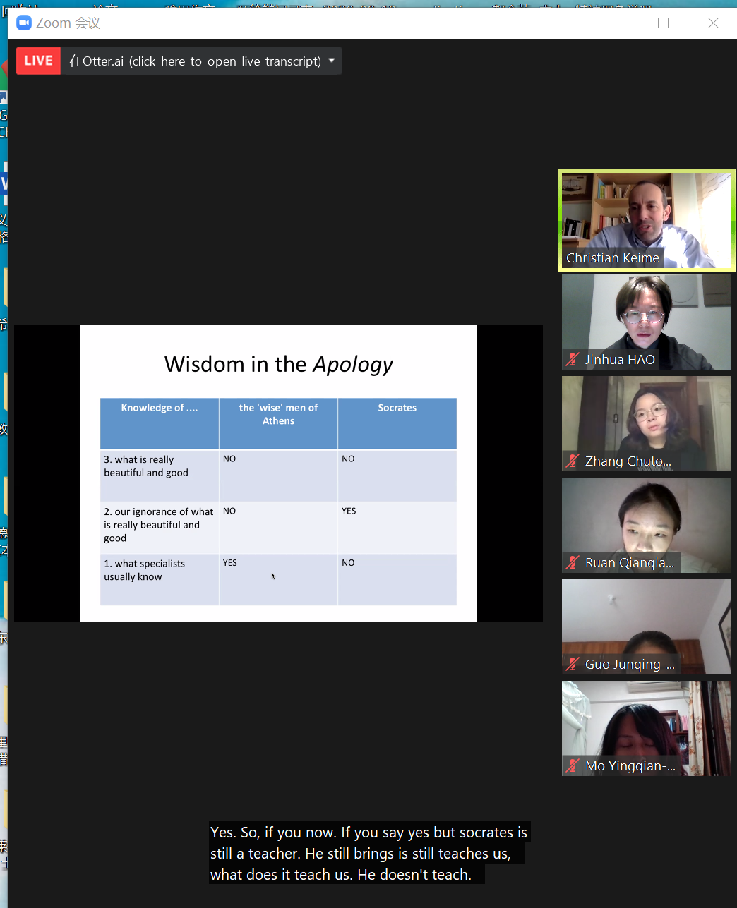 The second online course of the Cambridge Exchange Programme starts at ZOOM on March 2nd at 4 pm. The main topic of this course is the thoughts of Socrates. Professor Christian Keime first introduced the life and background of Socrates, and then explained the related content of Wisdom, Virtues, and Definition. Finally, he introduced Meno's Paradox through the dialogue Meno and explained Socrates' solution to this problem -- recollection. This course cited the contents of Plato’s dialogues such as Apology, Georgia, and Meno, which helped us to naturally transition to the next course about Plato’s philosophy. It also enabled us to get in touch with the English literature of Socrates' thought, which helped us to better connect our study of ancient Greek philosophy with western scholars’ research in the future. The professor spent two hours connecting the main thoughts of Socrates from a relatively macro perspective, which made our understanding of Socrates' ethics more systematic and provided an overall framework for us to study Socrates' philosophy in the future. Meanwhile, the explanation of "knowledge of knowledge", as the second type of knowledge, is of great help for us to understand Plato's "Form", which will be covered in the next course.