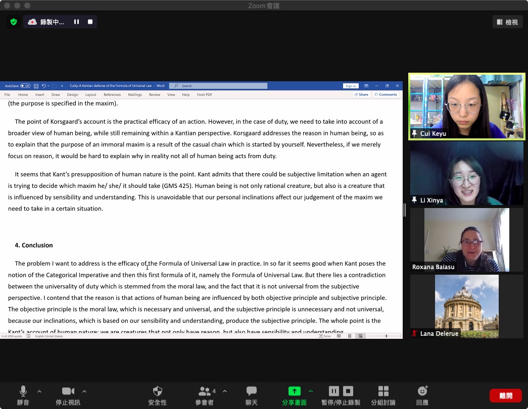 In the last 8 weeks I had a wonderful experience taking part in tutorials from Oxford University. My expected aims of this program are as follows: Firstly, to further understand the relevant knowledge of Kant's moral philosophy; Secondly, to experience the teaching of the world's top philosophy departments; Thirdly, to exercise the ability of oral expression and academic communication in English; Fourthly, try to use English to conduct normative academic writing.