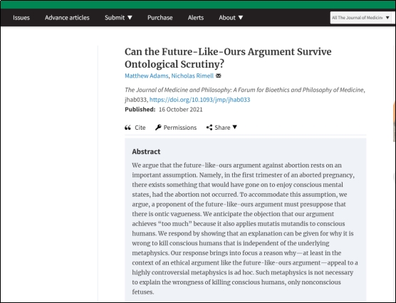 讲师Nicholas Rimell于2021年10月6日在Medicine and Philosophy期刊上发表了“Can the Future-Like-Ours Argument Survive Ontological Scrutiny?”一文。