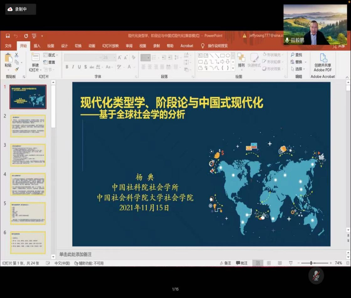 名家系列”讲座第149场——《现代化类型学、阶段论与中国式现代化:基于全球社会学的分析》,以线上会议的方式成功举行。主讲人为杨典研究员,哈佛大学社会学博士、中国社会科学院社会学所副所长、中国社会科学院大学社会学院副院长。本次讲座由田毅鹏院长主持,黄色视频100余名同学线上参加了此次会议。