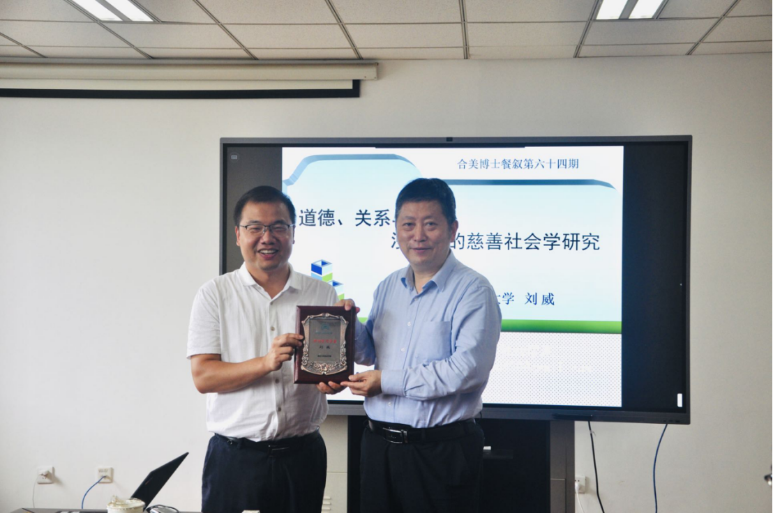 在合美博士餐叙上,刘威教授以“道德、关系与家国:漫谈我的慈善社会学研究”为题进行了学术分享。南京大学陈友华教授主持讲座,并向刘威教授颁发郑钢访问学者牌匾。方长春教授、邓燕华教授担任本次讲座评议人。
