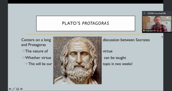 Reed教授在五节课中主要集中在柏拉图的《申辩篇》、《美诺篇》、《普罗泰戈拉篇》、《欧绪弗洛篇》等内容上。第一堂课上Reed教授介绍了关注苏格拉底哲学的必要性和苏格拉底的哲学使命,苏格拉底所关心的美德及其是否可教,何谓智慧和幸福的生活等与现代的我们仍息息相关的问题,并且让我们了解了苏格拉底的认识自身知识有限性的观点;第二堂课上教授介绍了苏格拉底的辩论方法,引导我们认识到使用清晰概念和反思自身信念的必要性;第三堂课上教授引导我们讨论智慧、美德和快乐的可能关系;第四堂课上教授引导我们讨论人是否有意作恶,善、利益和欲望在行为中的作用可能是什么;第五堂课上教授提出了苏格拉底在论断“美德是智慧,智慧可教,美德却不可教”中出现的悖论,引导我们继续关注美德问题。