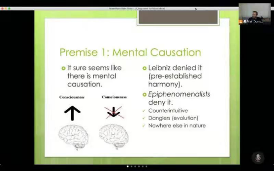 第三部分讲授了Arguments for materialism。Duncan在此列举了一些来自认知科学和神经科学领域对意识问题进行探讨的例子,如Crick 和 Koch的神经生物学意识理论,这些例子使得我们必须承认大脑在处理感觉和行为上扮演重要的角色,然而这些理论在解释心灵所具有的认知、情感、体验能力时是乏力的,这些例子无法说明物理过程为什么以及如何引起经验,纯物理的描述无法自动产生意识经验,对意识经验的解释需要建构一个完整的解释桥梁,这部分暂时还处于空白之中。