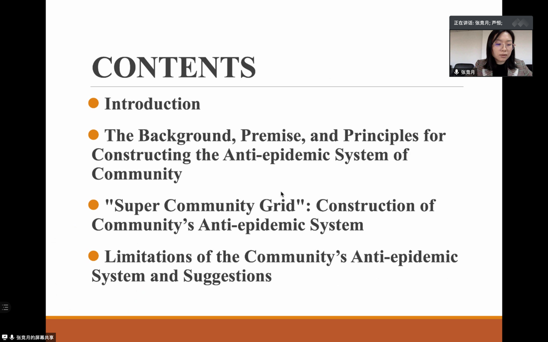 在新冠疫情与社会发展专题发言中,长春师范大学张竞月博士代表田毅鹏教授介绍了治理视域下中国城市社区抗击疫情体系构建情况。发言中提到以基层街居为基础建立起来的社区网格化治理凭借其基础性和覆盖性等优势,在中国抗击疫情中发挥了关键作用。在疫情袭来之际,基层政府果断迅速地将常态意义上的社区网格升级为社区抗疫的“超级网格”,通过党政机关工作人员“绑定性”下沉到街居,构建起超级网格的“主网”;同时还与社会组织、驻区单位、物业公司建立起密切协动关系,编织起社区超级网格中的“辅网”。在社区展开全面疫情排查,及早发现疫情,切断病毒的传播链,有助于保持社区的秩序和稳定。
