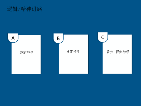 关于逻辑/精神之路,刘鑫区分了三种基本观点:柏拉图强调人神之间的差异,人无法通过感觉或理智认识神,通过否定神被认识的可能而建立起“否定神学”;亚里士多德肯定人神之间的共性,通过对比人的精神和绝对精神认为神能被人所认识,从而建立起“肯定神学”;以及托马斯·阿奎那强调人神之间既存在根本差异,也有因果性的关联,人与神之间既相似又不相似,通过“谓述类比”(analogia praedicationis)建立起来肯定-否定兼备的神学。