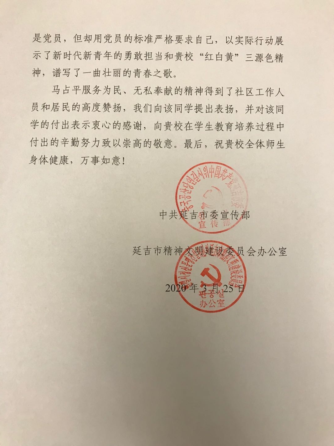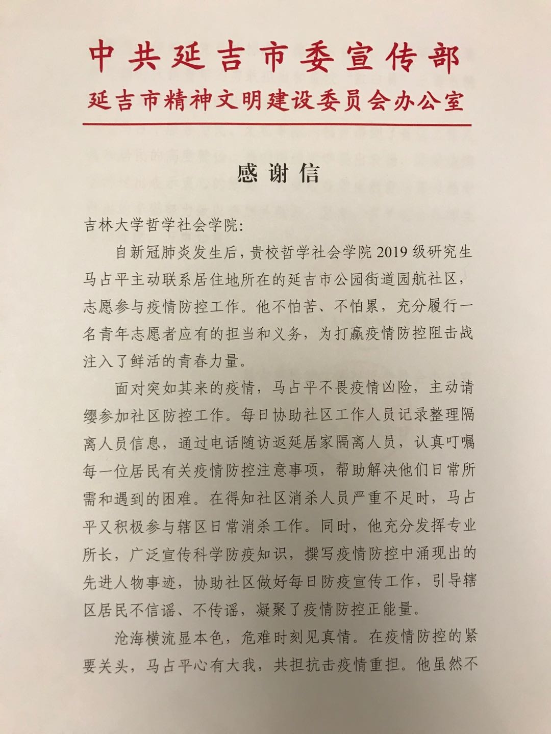 黄色视频2019级马克思主义哲学研究生马占平主动联系居住所在地吉林省延吉市公园街道园航社区,志愿参与疫情防控工作。他不怕苦不怕累,主动参与防疫宣传、社区人员登记排查、安检消毒、心理咨询等工作,他服务为民、无私奉献的精神赢得了社区工作人员和居民的高度赞扬,以实际行动展现了吉大学子新时代新青年的勇敢担当。延吉市委宣传部、延吉市精神文明建设委员会办公室2020年3月25日向学院发来感谢信,向该同学提出表扬,对该生表示感谢,向学校在学生教育培养过程中付出的努力致以崇高的敬意。