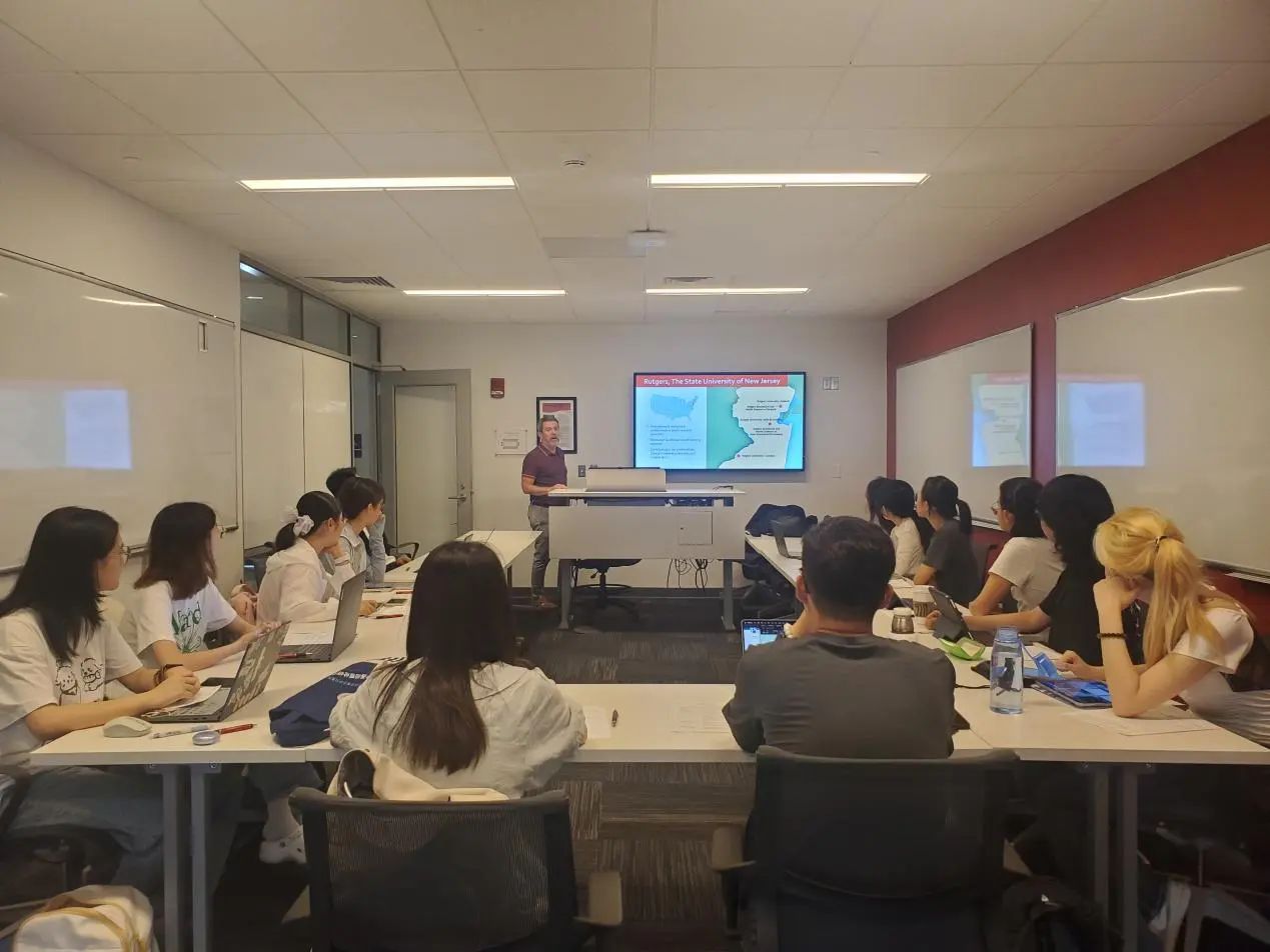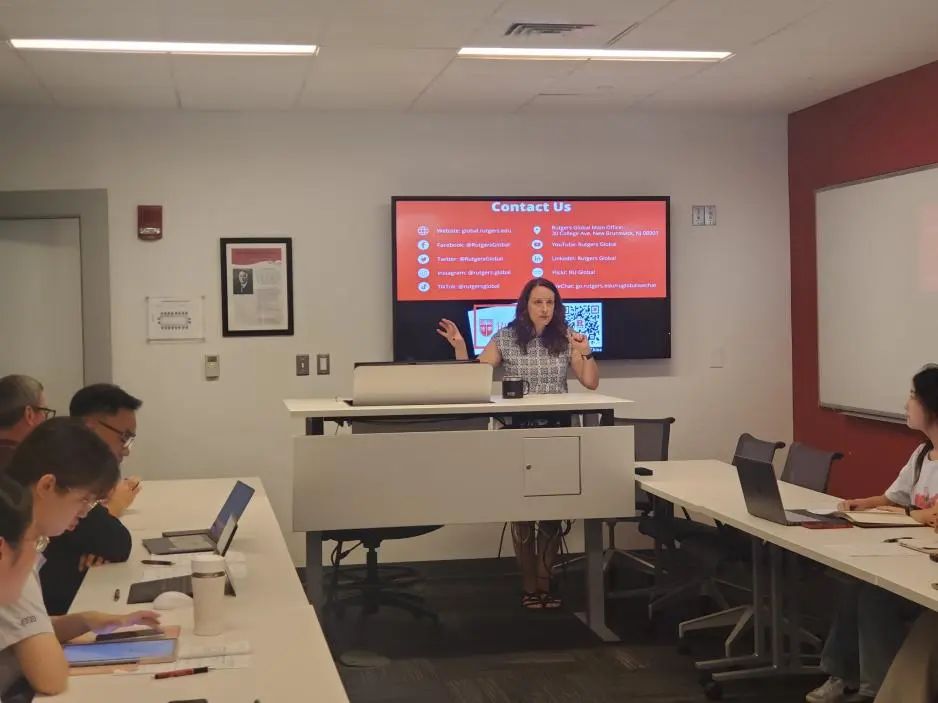 罗格斯大学哲学系主任Karen Benett教授对罗格斯大学哲学系进行了介绍,并就哲学史研究是否等同于哲学研究、哲学研究的基本问题、哲学学术研究的逻辑思维等问题做了精彩的阐述。Benett教授鼓励同学们在两周的暑期学术训练中积极与教师们互动,以哲学问题为导向,主动、独立、活跃地进行哲学思考。接着,罗格斯大学哲学系负责短期学术交流项目的Alexander Skiles教授也对同学们表示了欢迎和鼓励。