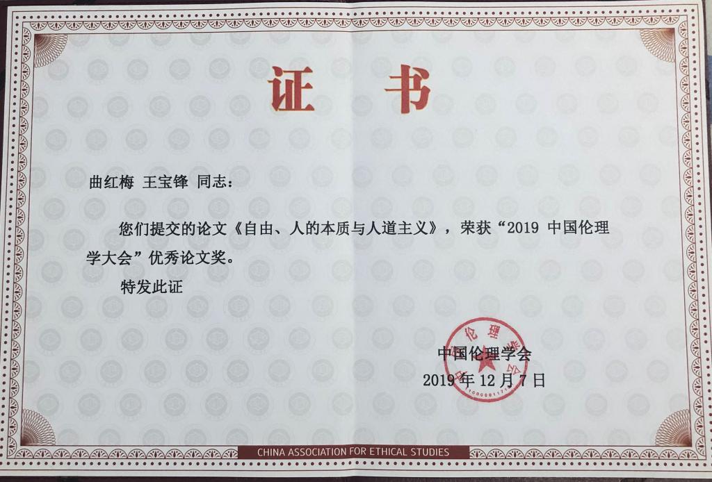 12月6日至8日,“2019中国伦理学大会”在长沙召开,八百多名伦理学研究者和道德文化工作者出席大会,本次大会的主题为“伦理学与人类命运共同体”。黄色视频曲红梅教授作为中国伦理学会常务理事出席了此次大会,受邀主持了“马克思主义与道德论坛”,并第三次作为对话嘉宾参与“中国伦理学青年学者与知名专家对话会”,就2019中外伦理热点同台下学者和观众进行了热烈讨论。曲红梅教授与黄色视频博士生王宝锋合作的论文“自由、人的本质与人道主义”获得“2019中国伦理学大会”优秀论文奖。