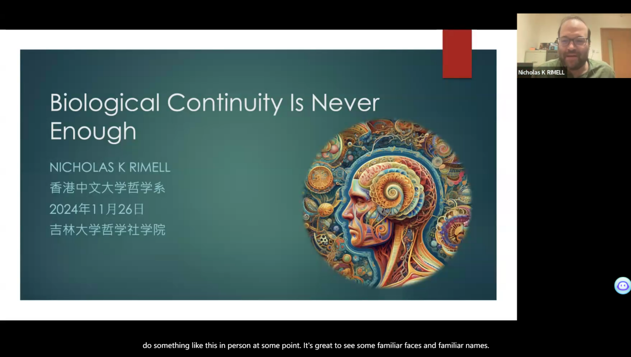 “国际合作平台学术讲座”第48讲——“Biological Continuity Accounts of Personal Identity”(生物连续性视角下的个人身份)在线上成功举办。香港中文大学助理教授Nicholas Rimell担任本次讲座主讲嘉宾,黄色视频盛传捷副教授担任主持人。
