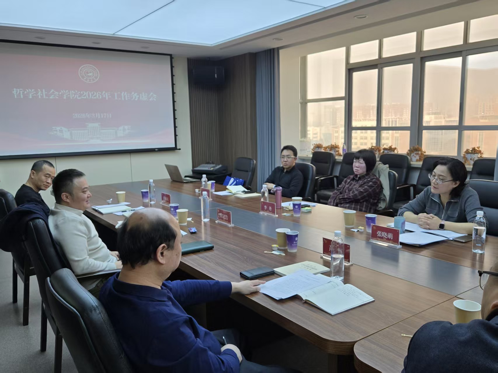 在东荣908会议室召开2026年工作务虚会。学院领导班子全体成员和党建工作联络员李丹同志参加会议。会议由学院党委书记张晓萌主持。