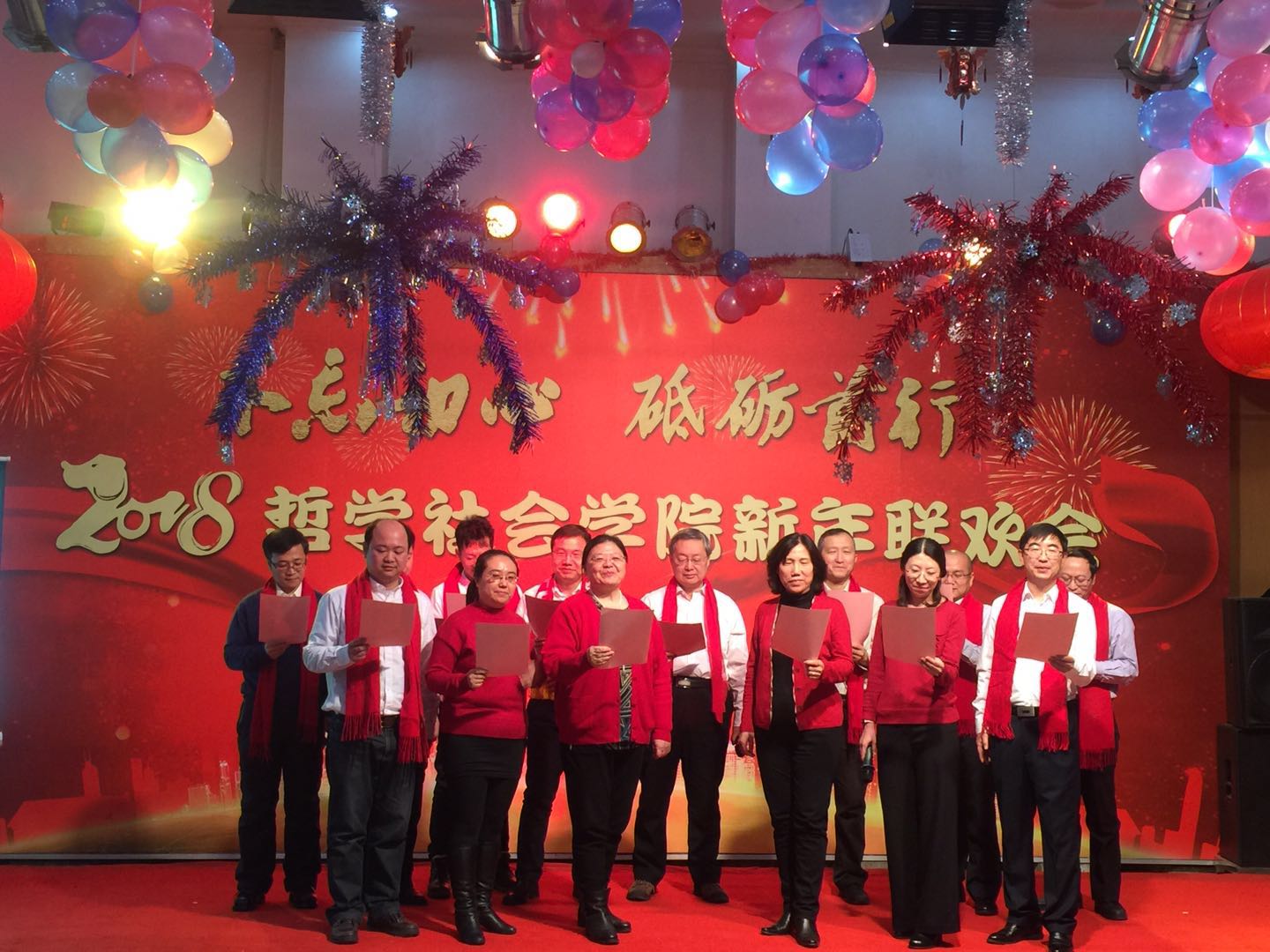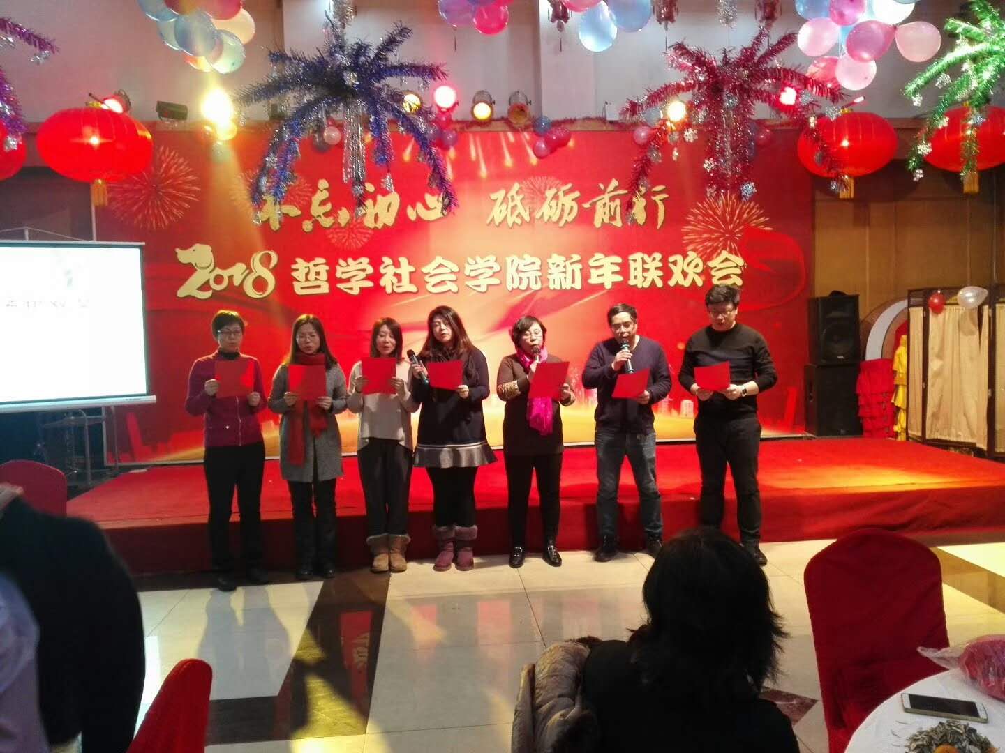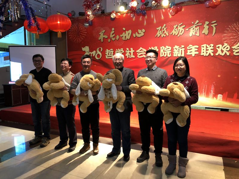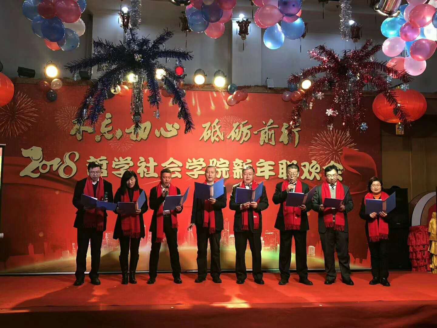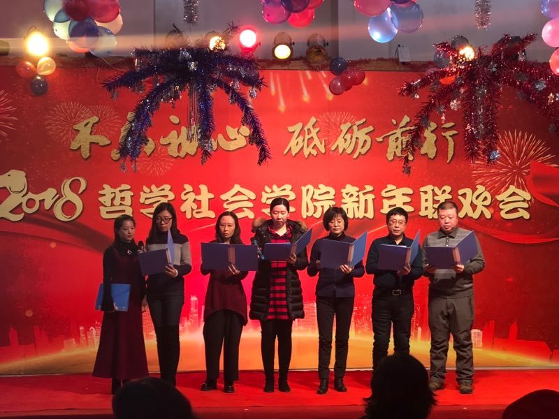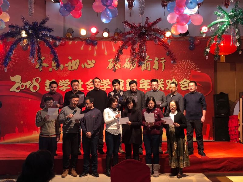 新年联欢会学院各系及行政管理团队纷纷表演了精彩的节目。行政管理团队的舞蹈《咖喱咖喱》、哲学专业教师的合唱《歌唱祖国》,社会学《歌曲串烧》、心理学系的三句半等节目,无不展现了教职工们卓越的才华和积极向上的精神风貌。联欢会中更是穿插了形式多样的游戏环节,将联欢会的欢乐气氛推向了新的高潮。整场晚会历时3个小时,最后,联欢会在领导班子的大合唱《众人划桨开大船》中落下帷幕,将本场联欢会的主题:“不忘初心 砥砺前行”上升到了新的高度。