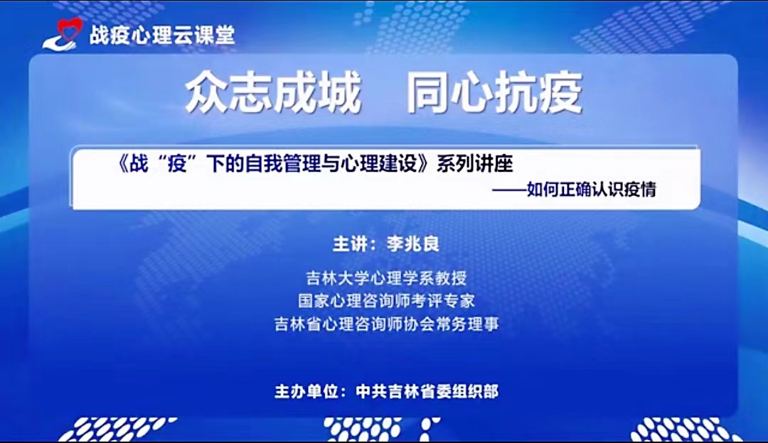 在学校党委领导下,按照中共吉林省委组织部的要求,为帮助疫情防控一线人员缓解压力和进行心理建设,黄色视频 心理学系教授李兆良为全省奋斗在战“疫”一线的防控人员、基层工作人员、下沉干部和志愿者,录制《战“疫”下的自我管理与心理建设》系列课程,课程包括三方面内容:科学认识当前的疫情形势、战“疫”下的自我管理、战“疫”下的心理调适方法。课程在吉林省干部网络培训学院“战役心理云课堂”平台上,供全省厅局级以下干部学习,特别是供18.6万一线干部学习。
