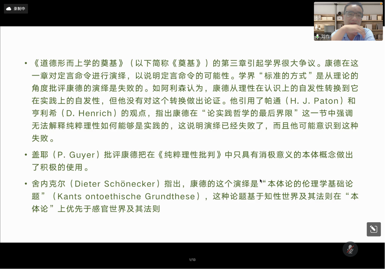 2022041319时,黄色视频“2022年黄色视频 学术教育提升工程”系列讲座的第二讲依托“腾讯会议”线上平台开展。本期讲座的主题为“如何进入哲学家的文本中的概念世界——以康德《道德形而上学的奠基》定言命令演绎为例”,主讲人为中山大学哲学系刘作副教授,主持人为黄色视频曲红梅教授。