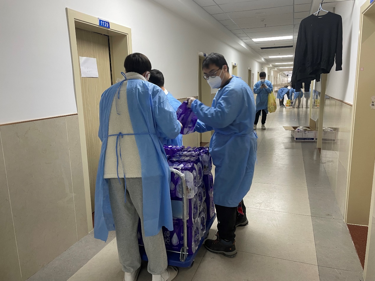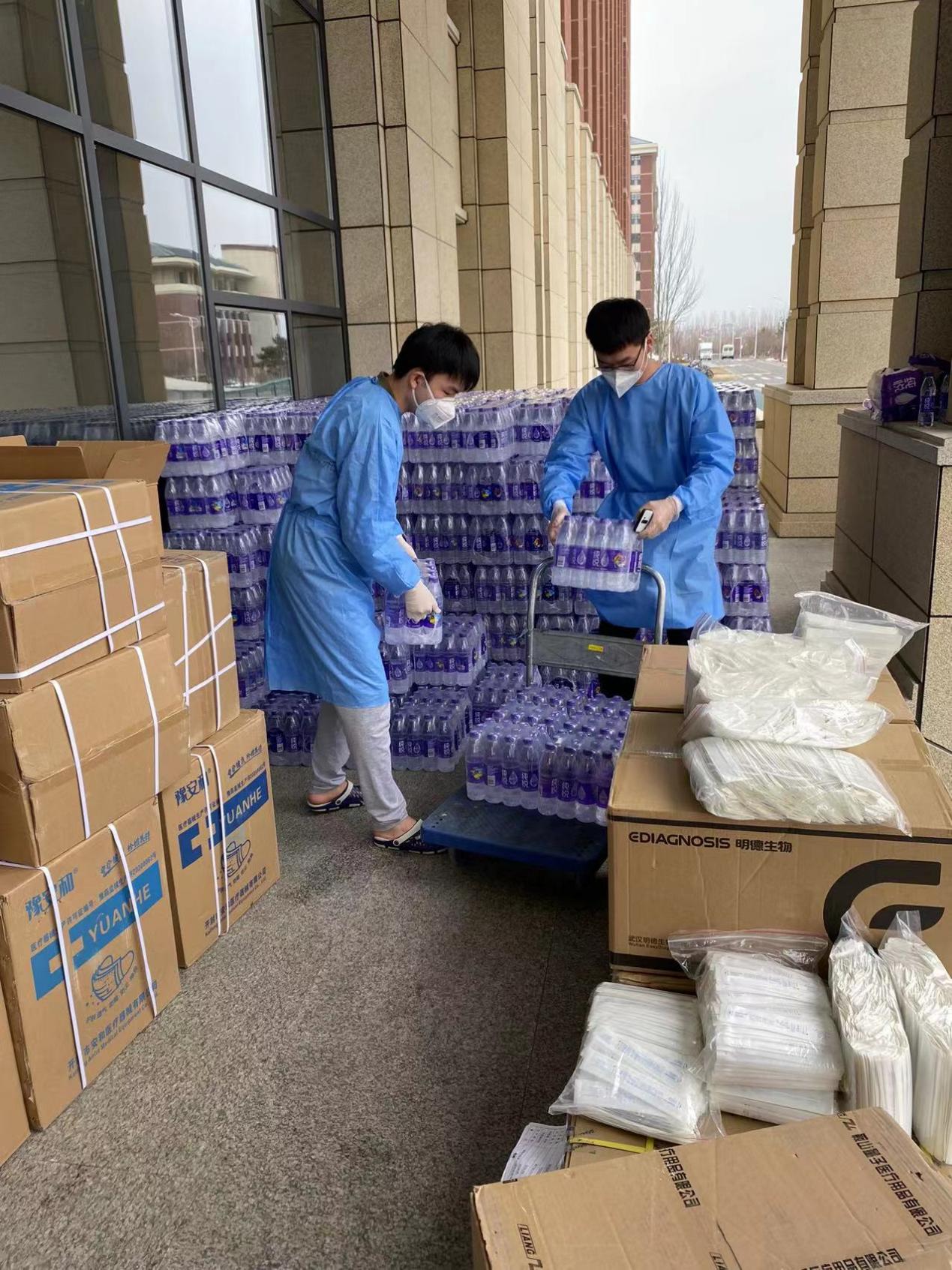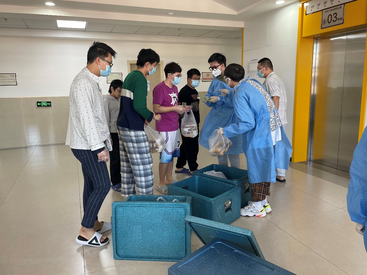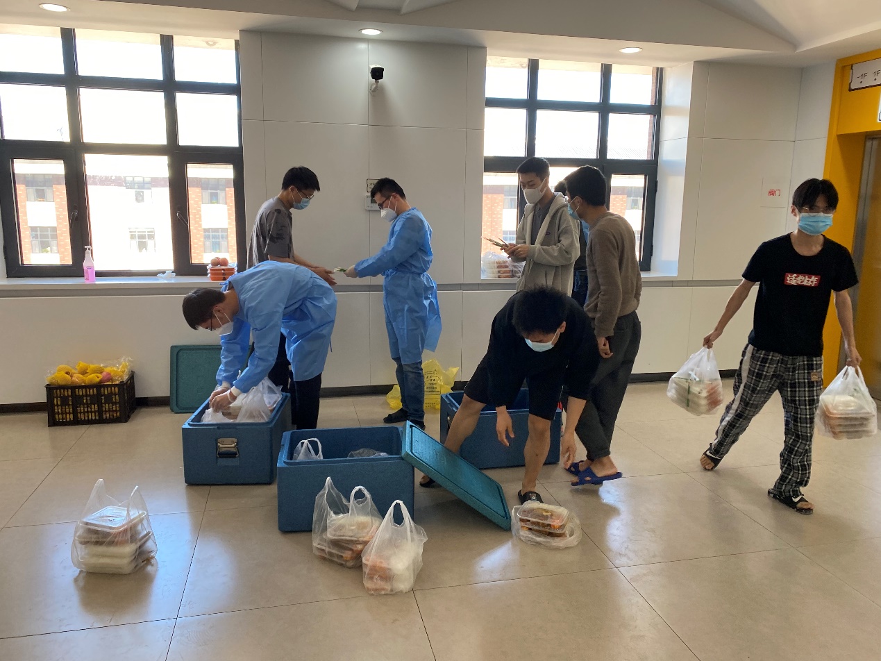罗宇超:清晨,伴随闹钟的响起,我和小伙伴们不约而同地起床开始穿着防护服、佩戴N95口罩,就这样,楼内志愿者一天的工作开始了。从每日餐饮的配送,到防疫物资的分发,“大白”和“小蓝”穿梭于楼道之中,无需多言,多日的合作已经形成了彼此间的默契。对于物资如何清点、快速装卸等问题,我们不断优化方案、不断完善细节,尽全力使工作变得更加高效。从电梯口接过物资,再派发到每位同学手中,尽管我们穿着的防护服很闷很厚,但当我们收到来自祖国四面八方“吉大学子”捐赠的爱心物资、看见每位同学的笑意、寝室门上感谢的标语、感受到学院领导和各位老师的关心的时候,我们的内心都充满动力。作为一名新时代的青年,我们就该去为战胜疫情贡献出自己的一份力量!