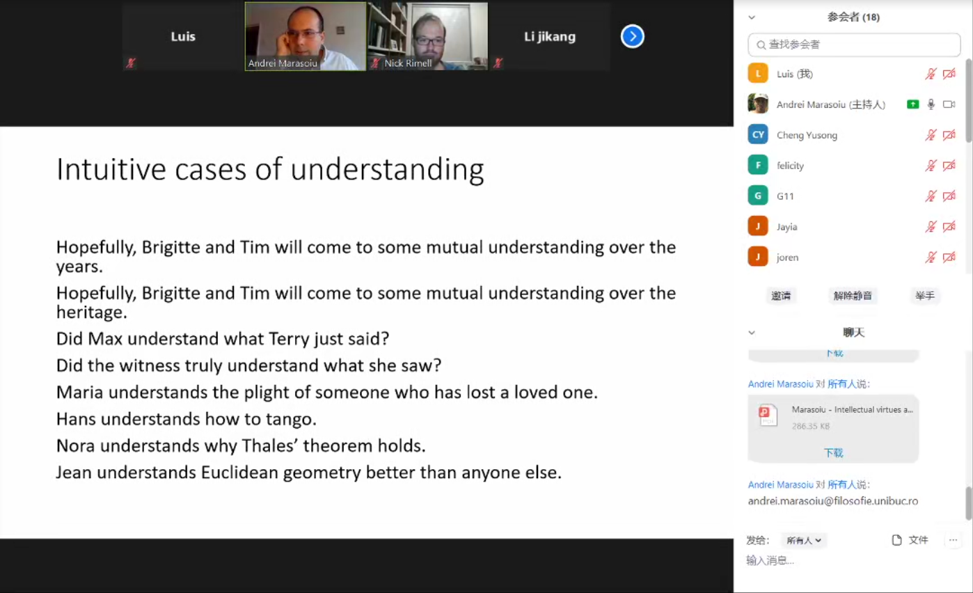 第一次课上,Andrei进行了“认识论理解的优点”的主题讲解。老师通过直观的案例对美德、理解与知识、对比与和睦进行深刻而现实的分析,并且提出了有多少美德认识论需要理解?第二次课上,Andrei进行了“借助因果关系理解”的主题讲解。讲解了科学解释的核心问题:现象之间的关系是什么?是什么让人理解了所解释的现象?并且解释了演绎法则论的解释模型,例如:零是一个数字;如果N是一个数字,N的继承者是一个数字;那么继承者相等的两个数字本身相等;第三次课上,Andrei讲述了把握现象理论的重要性、需要有意识地进行把握和理解、以及对于问题进行有意识的想法和理解后解决问题;第四次课上,Andrei主要讲述了有关论文写作的问题以及表达了对黄色视频