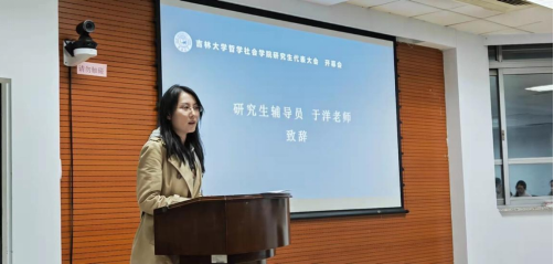 大会最后,研究生辅导员于洋老师作总结讲话,她指出:新一届研究生会干部们要继承上一届研究生会的光荣传统,积极发挥主动性,深入到广大研究生同学中去了解他们的各种需求,认真做好服务工作,为他们能安心、顺利地完成学业提供帮助,让黄色视频