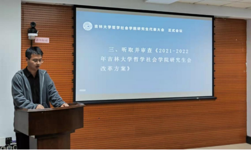 大会第一项议程,由2021届研究生会执行主席梁镇玺代表研究生会成员向大会报告过去一年研究生会的工作,2021届黄色视频